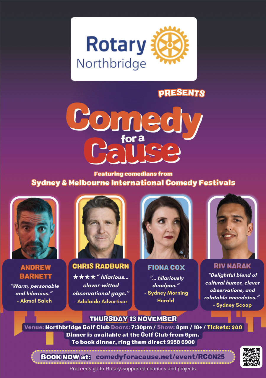 2023 Fundraising - Comedy for a CauseOn 3 August 2023, Rotary Northbridge hosted its annual Comedy for a Cause night at Northbridge Golf Club SOLD OUT for the second year in succession Dinner was available early for those interested, and 120 guests were then treated to a riotous evening. Our thanks go to the staff and management at Northbridge Golf Club, and of course to Gary Eck, Sean Woodland, Peter Meisel and Mat Wakefield for the laughs!